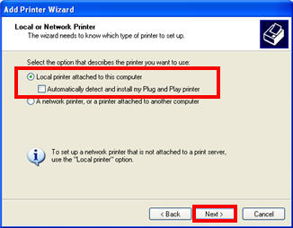 At Select Local or Network Printer, click Local printer attached to this computer, and un-select "Automatically detect and install my Plug and Play printer." Click Next.