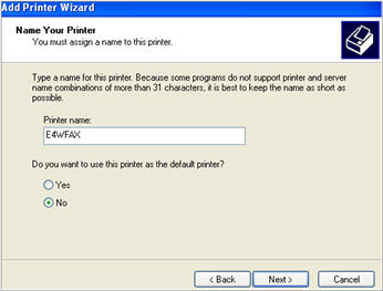 At Printer Name, type E4WFAX, select No for the default printer, and click Next.
