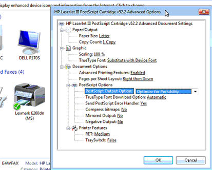 Expand the PostScript Options and set the PostScript Output Options to Optimize for Portability. Click OK, and then click Apply.