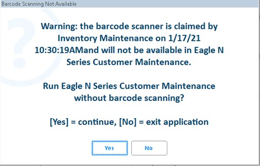 The first scan-enabled application that opens, controls and has exclusive use of the scanner. Subsequent applications that launch with scanning enabled will display a message indicating that another application has control of the scanner and scanning will not be available. The following is an example of the message the user will receive when this condition occurs.