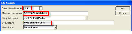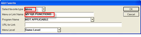 Menus (folders) help you organize your favorites, just like in Internet Explorer when you create a folder for your Favorites. To create a menu, select Menu from the drop-down list. In the Menu or Link Name field, enter a name for the menu. For example, you could enter "MY G/L FUNCTIONS" or "MY WEB SITES" (Tip: you may want to use all caps for menus for easy identification when making changes to your Favorites structure).