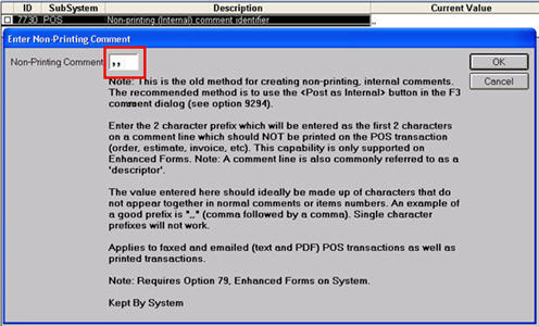 Enter the two-character prefix you want to be entered as the first two characters on a comment line which should NOT be printed on the POS transaction (order, estimate, invoice, etc). This capability is only supported on Enhanced Forms. Note: A comment line is also commonly referred to as a "descriptor."