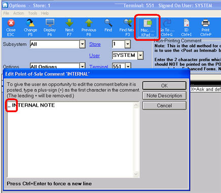 Once this option is set up, in Options Configuration click Misc and select “N- Maintain POS and PO Pre-Defined Comments,” then select “1” – “Maintain POS Comments.” Then prefix all comments you want to default to internal with the two commas.