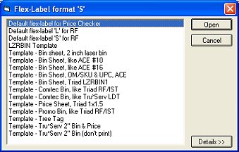 When you click in the Current Value column to set up this option, the "Flex-Label format 'S'" dialog displays. Highlight the label format you want to use, and click Open.