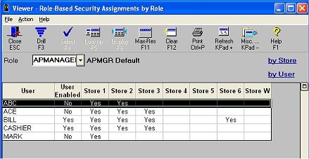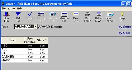The users associated with the selected role display in the viewer. Below is an example of the Viewer for both single store and multistore. "Yes" in the Store column(s) means that the user has the selected role assigned to them in the specified store. The "User Enabled" column specifies whether the user has been changed from Terminal-Based to Role-Based Security.