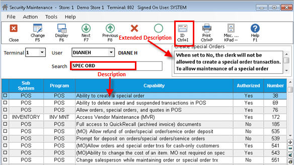 - To search for a security bit, enter a search word(s) in the Search field, and the system searches both the Description and Extended Description for the value you entered. The security bit(s) containing that value display in the grid. Note: Entering multiple words (partial or entire words) in the Search field executes an "and" search. For example, entering SPEC ORDER finds security bits that have a word that begins with spec (ie special or specify) AND also has a word that begins with order. In this example, the search would display an option that contains the words order and specify. Entering SPECIAL ORDER would not include that security bit, since it contains the word specify but not the word special.