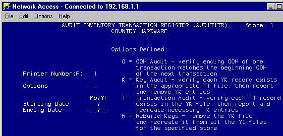 An audit utility is available to check the files that store ITR records. Generally, you would only run this utility when instructed to do so by an Eagle Advice Line representative. The utility is AUDITITR and is run from Network Access.