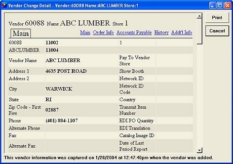Notice you can also click any of the links (Order Info, Accounts Payable, etc) to display snapshots of the other screens of Vendor Maintenance .