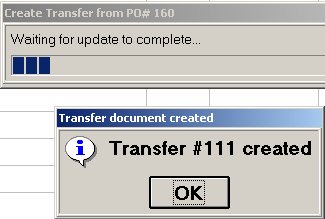 A status bar displays indicating that the transfer is being created. Another dialog displays indicating that the transfer document was created and provides the document number of the transfer.