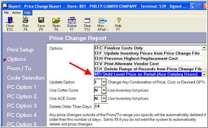 Specifying the same range of items you used in RICU in step 3, run the Price Change Report (RPC) with Option Y "Add Level Price as Retail” to update Retail with the Level 1 or Level 2 price from the Ace catalog.