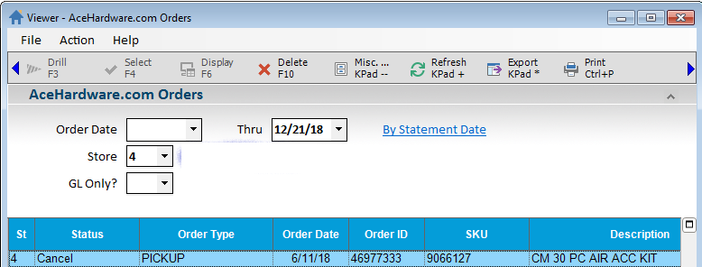 With Release 28.1 Eagle can accept acehardware.com transactions that were canceled by the customer. When Eagle receives a cancellation from Ace, the committed quantity is reduced by the order quantity of the transaction. The VIEWAHCM viewer displays the transaction with the "Cancel" status as shown in the screen below: