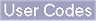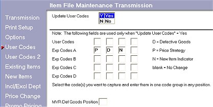 . Select Yes or No to update user codes. If you select Yes, use the bottom portion of the screen to enter the letters of the user codes you want to update. You must use only one User Code group but you can update any position in the group. In the example below, all three user codes (D, P, and N) are being updated in the Exp Codes A group.