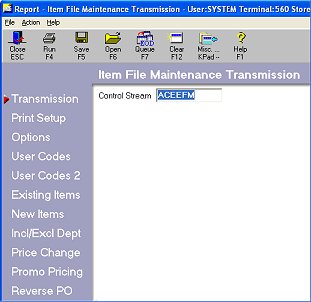 In the Item File Maintenance Transmission window, in the Control Stream field, enter the name of your EFM control stream, or leave the default if your control stream name is ACEEFM.