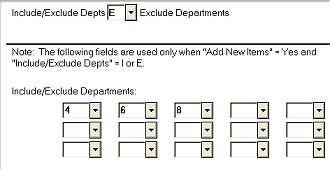 . If you selected Yes to Add New Items in the previous step, use this page to include or exclude items from certain departments. For example, if you want to exclude items from departments 4, 6, and 8 from being added to your inventory, set the "Include/Exclude Depts" field to E, then enter 4, 6, and 8 in the fields below.