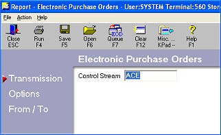 In the Electronic Purchase Orders report window, in the Control Stream field, enter the name of your control stream for sending POs, or leave the default if your control stream name is ACE.