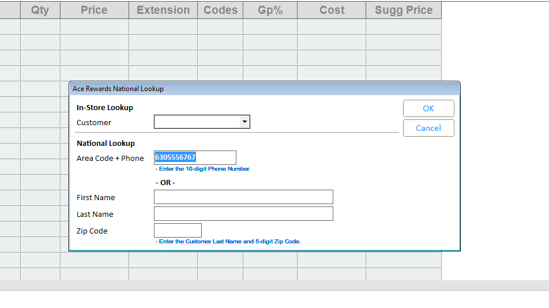 If the phone number entered for National Lookup is not found, clicking on the <Cancel> button exits the Ace Rewards lookup process and takes you back to POS.
