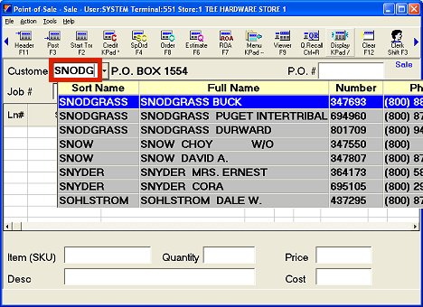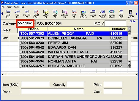 If you want to look up the account by phone number, type all or some the customer’s seven or ten digit phone number (do not type parentheses or hyphens) in the Customer field. Highlight the correct account, and press ENTER to accept it.