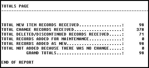 Totals— This section shows information about the total number of records received for new and existing items, file numbers, and dates. Note that it is normal for the number of records to not add up to the Grand Total number.