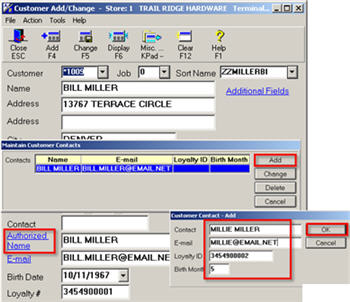 (Optional) Once True Value begins allowing option 1044 "Enhanced TV REWARDS Loyalty on System" to be set to Yes, if two or more individuals share an account and have separate True Value Rewards numbers, you can link them both by accessing the “Authorized Name” hyperlink and selecting the “Add” button. When the information is entered, click OK.