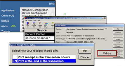 When the Receipt Printer window displays, select the "When" button, select EN "Print at the end of the transaction," and click OK.