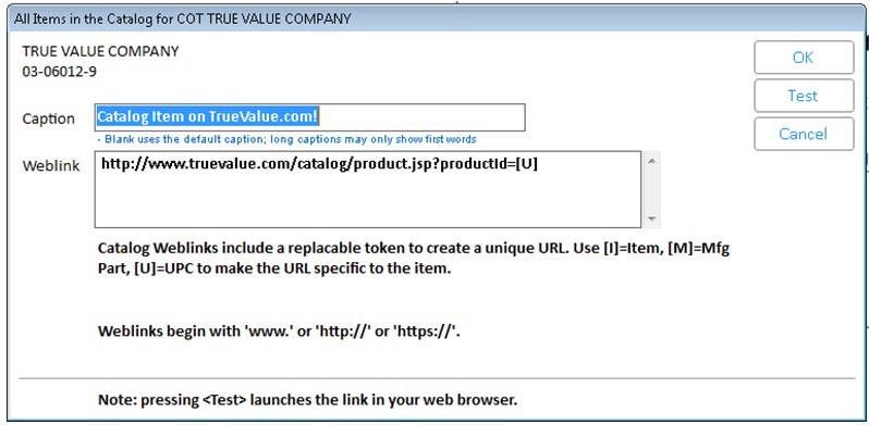 Use the “Test Item” button to test if the link leads to the desired webpage. If you used a token [I], [M] or [U], you will be asked to enter an item / mfg part# or UPC to be used during the test.