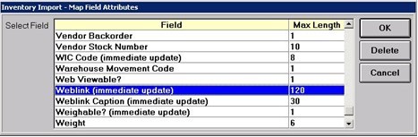 Inventory Import supports importing up to 5 Weblinks for an item at one time. The import only adds Weblinks, up to the maximum of 5. It does NOT change or delete existing Weblinks. Continue to use the Weblink Maintenance Viewer for those processes.
