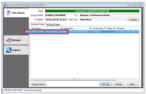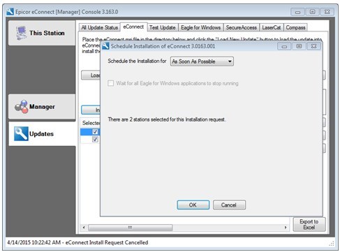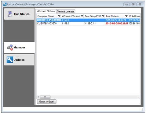 The Manager tab self-populates with useful information about each of your eConnect stations. If desired, you can export information from the Manager tab to Excel. Most information is self-explanatory, but the red time stamp means that a station has not checked in since that time stamp. A station name in bold blue text designates the current Manager Console.
