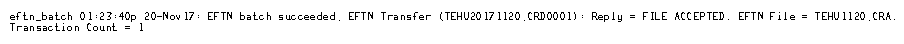 If the EFTN batch is successful, the following message displays in the File Transfer Audit Log in SHOWLOG: