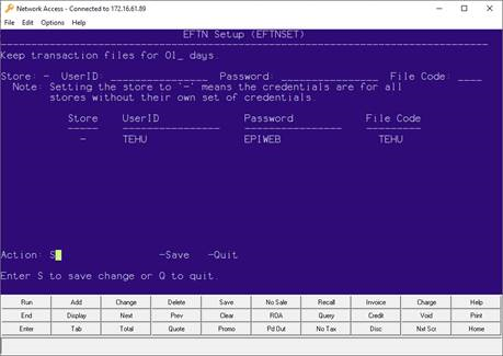 Tab to the action choice and type <S> to save the EFTN Setup. If you do not want to save what has been entered, type <Q> to quit the Setup.