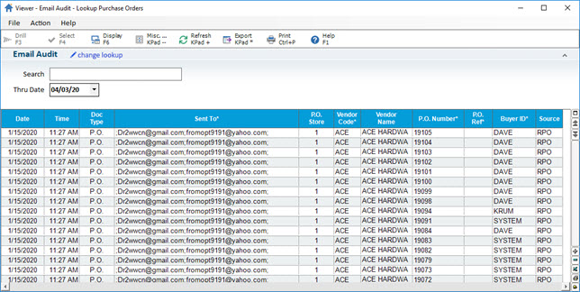 The Email Audit Viewer allows you to view information for new purchase order and invoice emails. For invoice emails, this includes Invoices, Special orders, Orders, Estimates, and Credit Memos. You can sort emails or use the Search to find specific transactions.