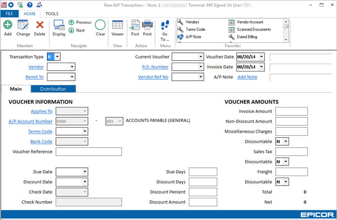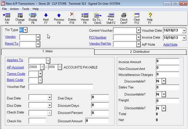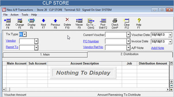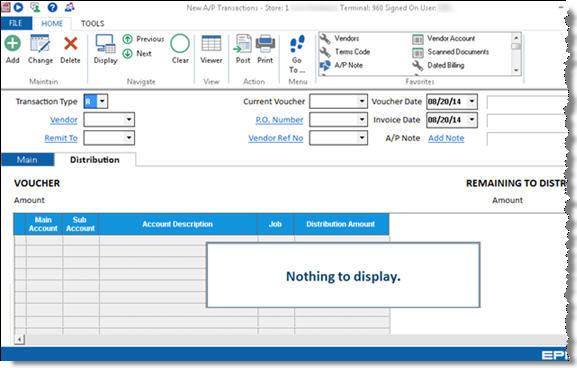 Note: if the vendor is set up with automatic distribution, then the automatic distributions will display. If you accepted them on the original transaction, accept them now (in other words, you don't need to manually distribute). If you didn't accept the automatic distribution on the original transaction, you must change the distributions accordingly. This may include changing, deleting, or adding distributions. When you are done, the distributions must match the original transaction exactly.