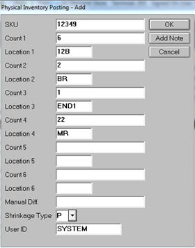 You can enter up to six counts and six locations for a single item. You must enter a count for each location you enter. Keep in mind that while the system will update all six locations, the counts are added together and updated as one figure in the quantity-on-hand field in Inventory Maintenance.