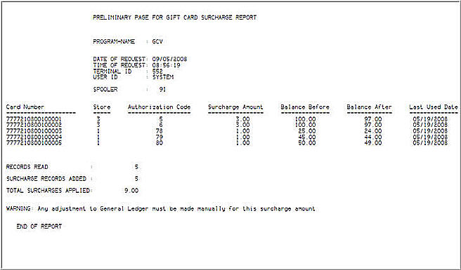 The Gift Card Surcharge Report (listed as "GVC" in the spooler) lists the cards to which the charge applies, before and after amounts, and the total surcharge amount for that entire run. See the sample report below.