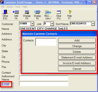 (Optional) If you set option 3509 "Allow access to customer contact fields in Customer Maintenance" to Yes, then you can click the Email hyperlink to add/change/delete customer contacts.customer contacts or email addresses for A/R statements and Invoices/Orders.