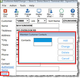 Have access to the Email hyperlink, which allows you to add/change/delete customer contacts, as well as add/change/delete the email addresses for A/R statements and Invoices/Orders. You must also set bit 733 “Ability to add/change/delete customer contacts (names)” to Yes for any clerks who will have this capability. If bit 733 is set to No for a clerk, the Email field label will not be a hyperlink.