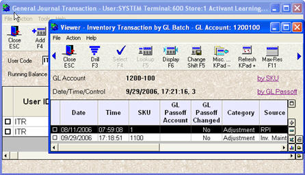 Once an ITR transaction has been passed off to general ledger, you can "drill down" from a G/L entry to the ITR transaction that makes up that entry. For example, if the G/L entry was created from a shrinkage record in ITR, you can click the Drill button in either the General Journal Transactions (GGMU) window or from the General Ledger Detail (GINQ) window to drill down to the ITR record that makes up the shrinkage amount.