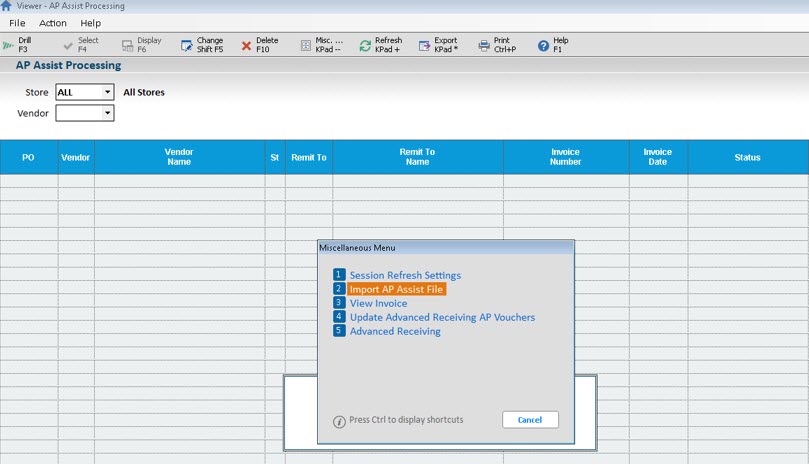 From the AP Assist Processing Viewer, go to the Misc Menu and select Option 2 – Import AP Assist File: