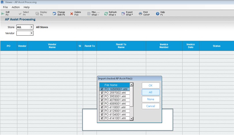 The ‘Import checked AP Assist File(s)’ will appear. Check the invoices to import or press the ‘All’ button to select all invoices within the AP Assist folder, then press OK: