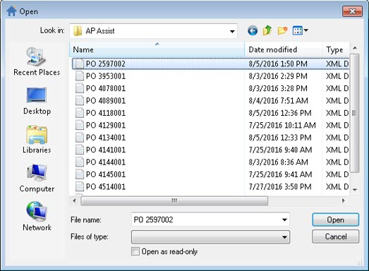 From the AP Assist folder, highlight one of the invoices and select Open: