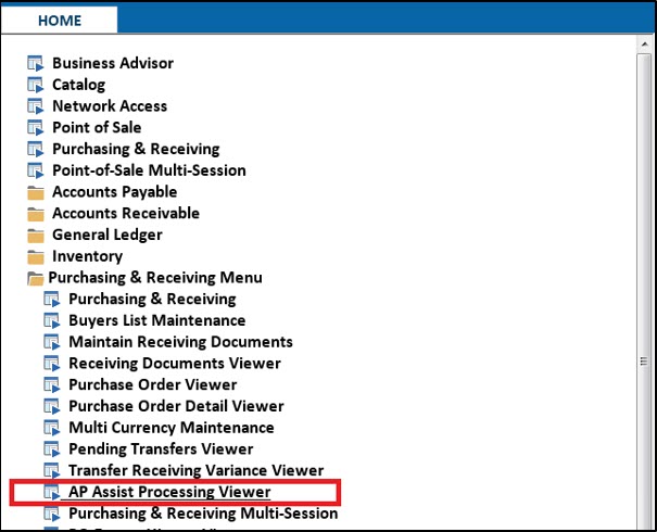 Once the required options and security have been turned on, the AP Assist Processing Viewer will be visible in the Purchasing & Receiving Menu in Eagle Browser: