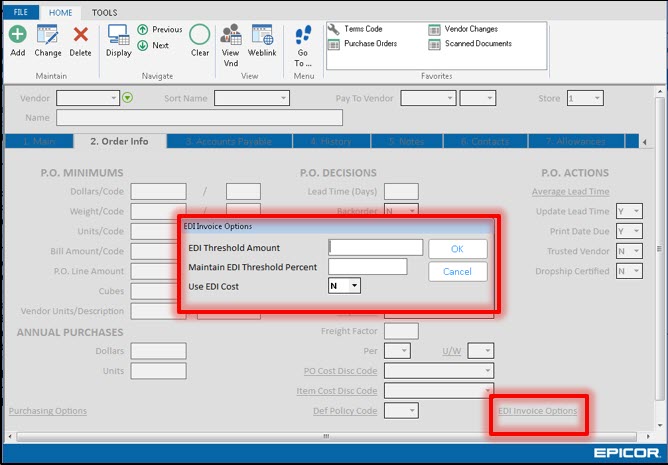 If a vendor needs a different threshold percentage and amount defined, the EDI Invoice Options on the Order Info tab in Vendor Maintenance are available: