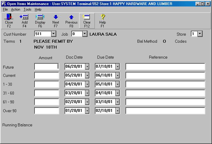 Important: If any of your accounts require that individual documents be entered into A/R, use Open Item Maintenance to enter each individual invoice (and credits, if any) rather than using this procedure, which simply adds a total for each aging bucket.