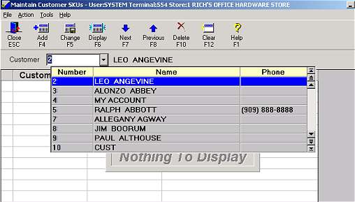 Use this procedure to set up customer-specific SKUs. For example, a particular commercial/industrial account has certain SKUs that they want to print on their invoices for the items they buy from you. In the Maintain Customer SKUs window, you link actual SKUs to the customer's SKUs.