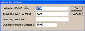 The descriptions of the first three special charges come from options 8371, 8372, and 8373, which you set up earlier. In the example below, the customer will be charged 5% for any deliveries between 50-100 miles, 7% for deliveries over 100 miles, and their finance charge on past due statements will be 10%.