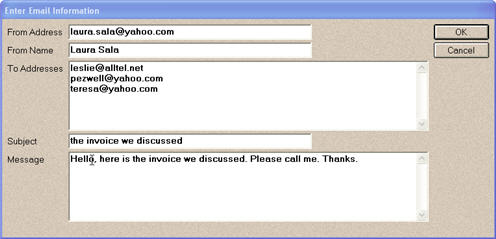 In the dialog box that displays, fill in the fields. You can enter up to 10 email addresses in the To Addresses field; enter one email address per line, pressing Control-Enter to start a new line. If you already set up email addresses in Customer Maintenance, those email addresses display automatically.