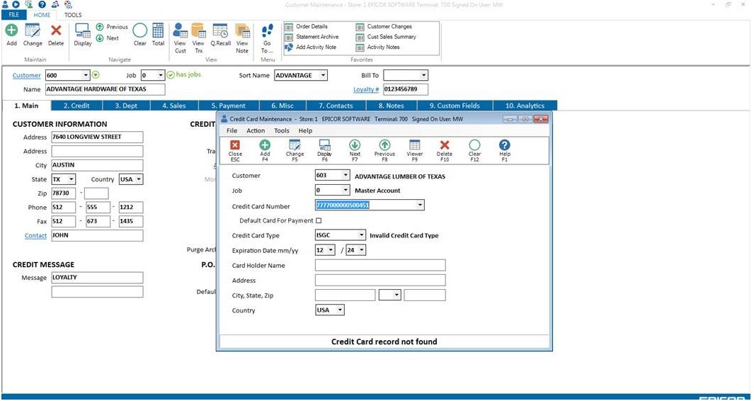 All BlueTarp accounts are stored using the stored Credit Card in Customer Maintenance (MCR). For each BlueTarp customer, create a customer record in MCR and enter the BlueTarp account number in the Credit Card field (Go To->Option A). Below is a screen shot of how to enter the account number in the stored credit card maintenance window in MCR.