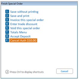 If an order already has a deposit hold, the order / special order finish order menu will include an option to cancel the deposit hold.
