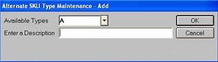 Click Misc, and select Alternate SKU Maintenance Viewer. From the viewer, click Misc and select Maintain Alternate Item Types. The Alternate SKU Type Maintenance dialog displays.