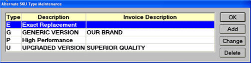 Before you set up alternate item lists, set up Types so you can group alternate items together. For example, you might have a type for "substitute," "exact replacement," "generic brand," etc. Once you've set up Types, you will assign the appropriate Type to alternate items, as well as indicate in Customer Maintenance which Types are not acceptable to particular customers.