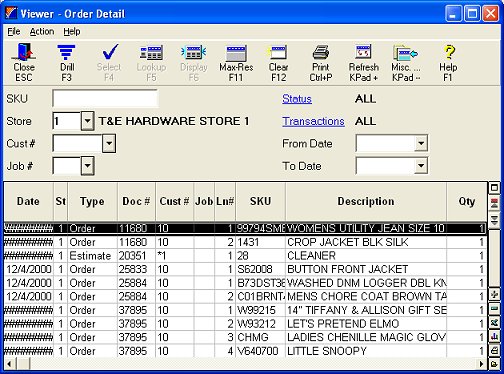 The Order Detail Viewer is a very flexible and powerful viewer which provides line-item detail for open POS Documents. It offers a variety of lookup methods, including SKU, customer, from/to dates, transaction type, and status. Below are a few examples of the flexibility of these lookup methods: